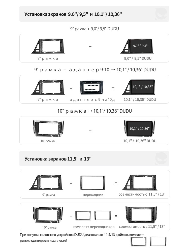 | Размер | 11,5 дюйма. Устройство можно установить через рамку-адаптер из комплекта на 9 и 10 дюймовые рамки! |